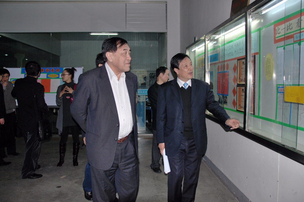 原國家人事部副部長、時任浙江省省長萬學遠(左二)等領導在浙江宏達經編股份有限公司指導工作