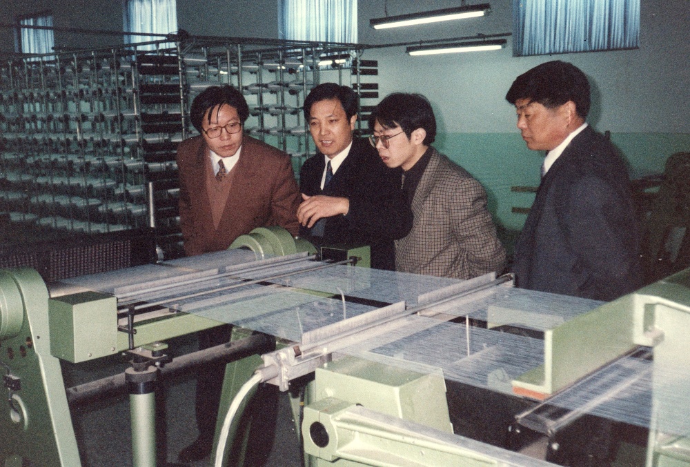 時任海寧市市長應忠良(左)在浙江宏達經編實業公司車間