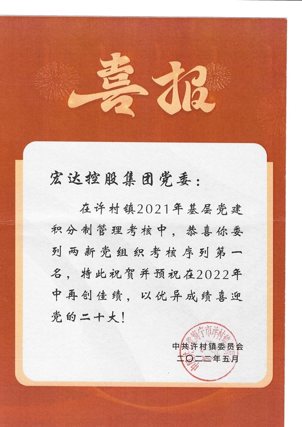 宏達控股集團黨委在許村鎮2021年基層黨建積分制管理考核中,委列兩新黨組織考核序列第一名。