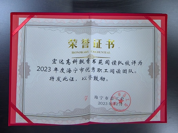 4月8日,“工會向潮?悅讀相伴”海寧市職工有聲書屋建設現場會暨海寧市第七屆職工文化藝術節開幕式在鹽官鎮舉行,宏達高科控股股份有限公司在會上被評為海寧市“書香企業”,“宏達高科”飄香書苑職工閱讀團隊被評為2023年度海寧市優秀職工閱讀團隊。