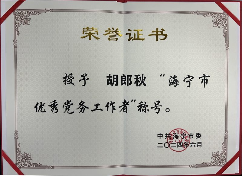 6月27日上午,海寧市召開慶祝中國共產(chǎn)黨成立103周年暨“兩優(yōu)一先”表彰大會(huì),胡郎秋同志在會(huì)上獲評(píng)“海寧市優(yōu)秀黨務(wù)工作者”。