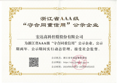 2024年8月,宏達高科通過浙江省AAA級“守合同重信用”企業復評。據悉,“宏達高科”自2009年首次獲評,已連續多年被評為浙江省AAA級“守合同重信用”企業。