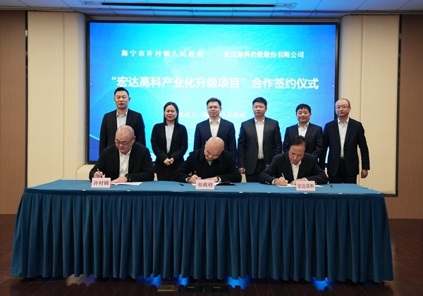 近日,海寧市許村鎮人民政府和宏達高科控股股份有限公司在許村鎮舉行“宏達高科產業化升級項目”合作簽約儀式,海寧市委書記徐明良、市長許紅蓮、市委副書記呂忠飛等市領導參加并見證簽約,許村鎮黨委書記許新峰、鎮長朱永斌,宏達高科董事長沈國甫、副董事長沈珺出席儀式。