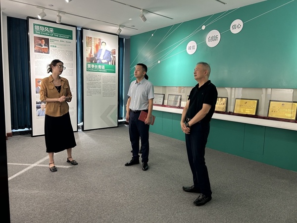 在許建舟總經理的陪同下,吳躍峰書記一行參觀了宏達高科展廳,了解了公司的發展歷程、企業文化、產品等。