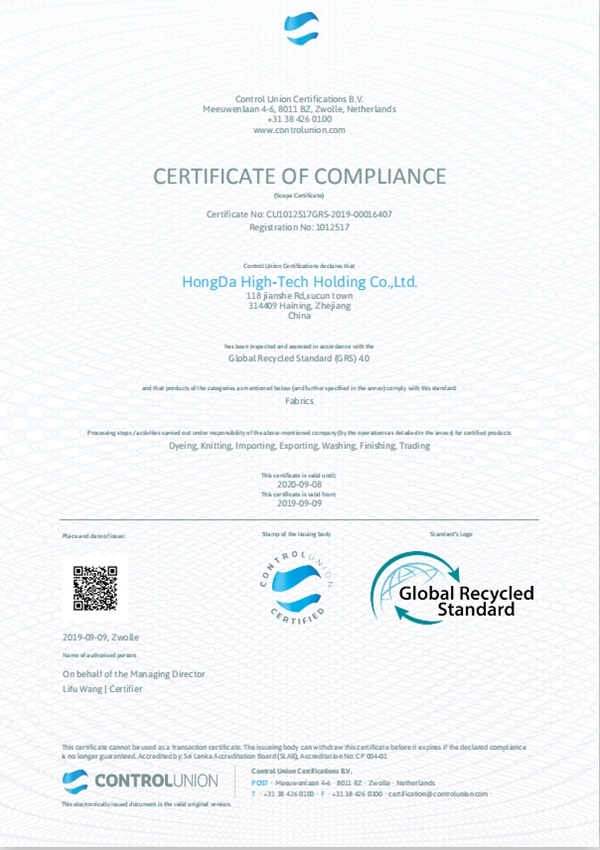 據(jù)了解,GRS認(rèn)證是全球回收標(biāo)準(zhǔn)的簡稱,是國際環(huán)保認(rèn)證機(jī)構(gòu)管制聯(lián)盟認(rèn)證機(jī)構(gòu)制定的針對回收纖維所建立的驗證標(biāo)準(zhǔn);申請GRS認(rèn)證的企業(yè)必須符合環(huán)境保護(hù)、可追溯、再生標(biāo)志、社會責(zé)任和化學(xué)品管理五大方面要求。
