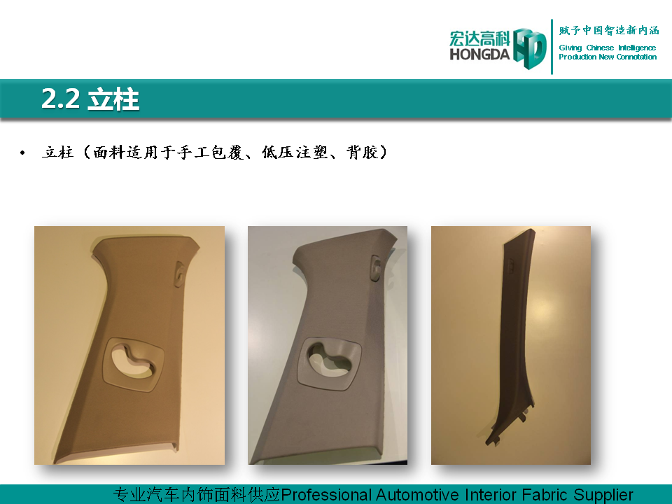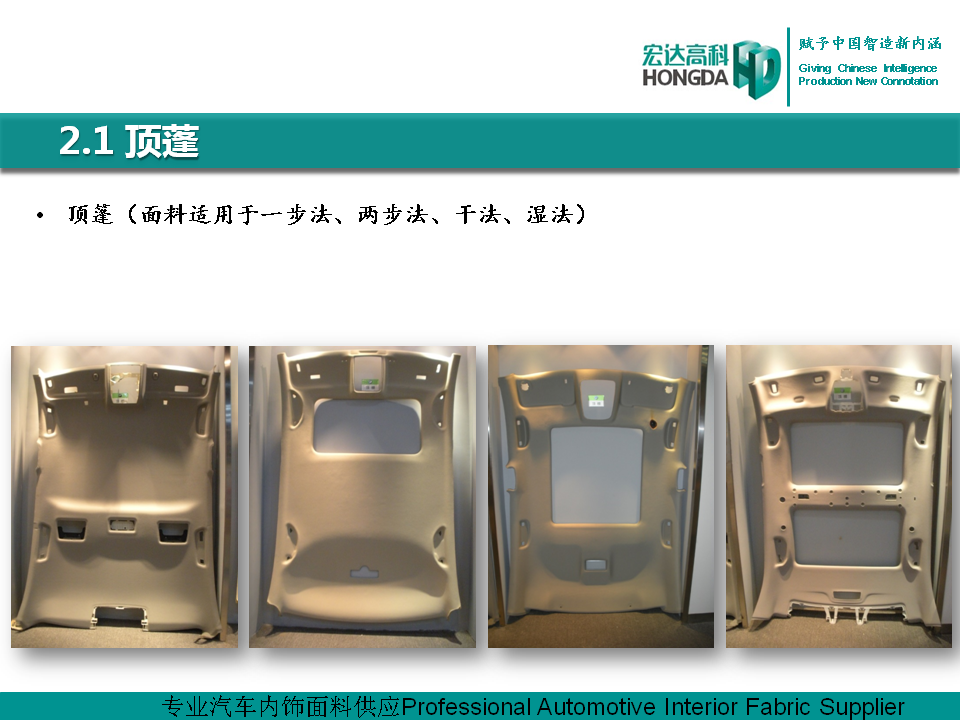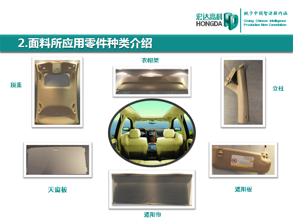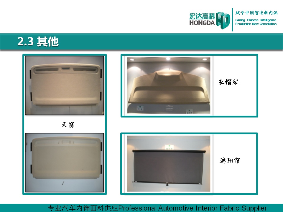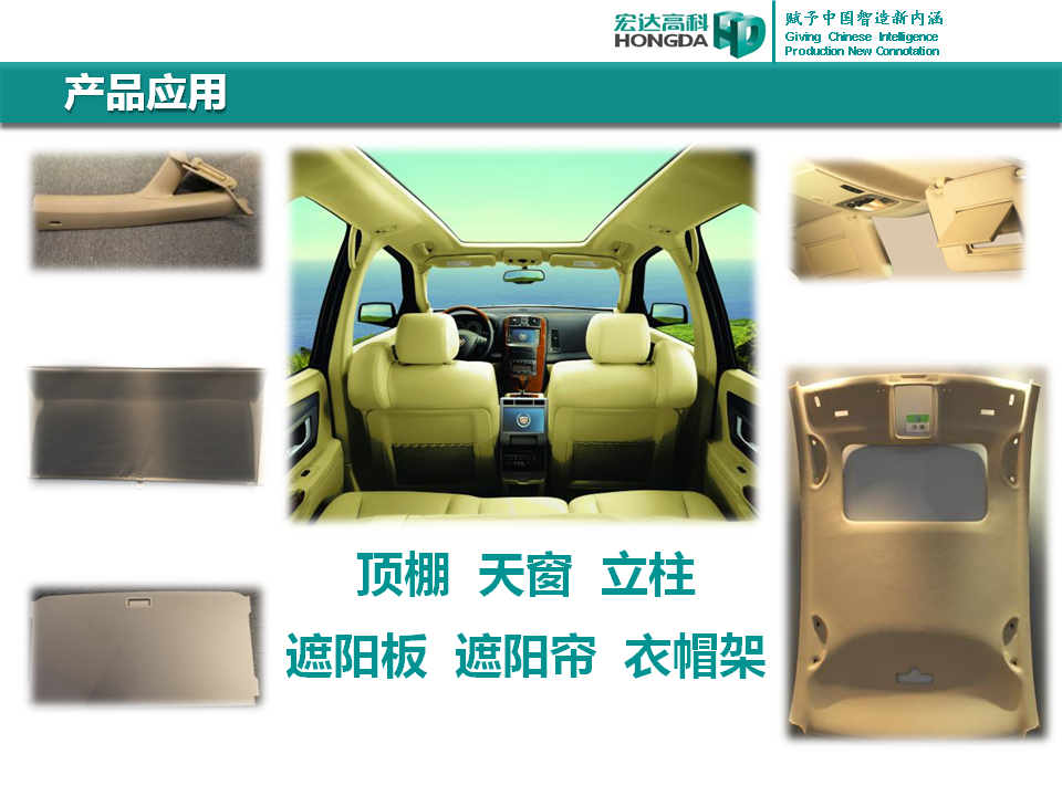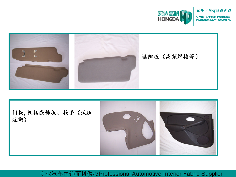 汽車內飾面料是宏達高科的主導產品,通過國家火炬計劃項目驗收,列入國家重點新產品。產品采用進口原料和先進的生產工藝,具有防油、防水、防污、吸音、阻燃、耐光照等特性,各項技 術指標性能達到國際先進水平,現已成為國內十多家大型汽車制造企業主要的內飾面料供應商,并出口美國、德國等